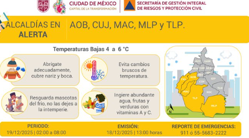 En dicha alcaldía se prevén temperaturas de entre 4 y 6 grados Celsius entre las 02:00 y las 08:00 h del viernes 19 de diciembre.