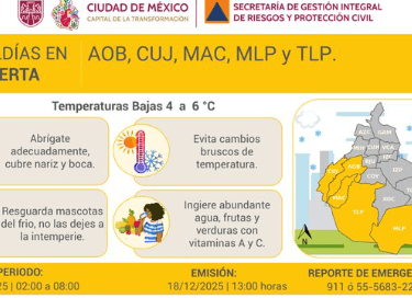 En dicha alcaldía se prevén temperaturas de entre 4 y 6 grados Celsius entre las 02:00 y las 08:00 h del viernes 19 de diciembre.